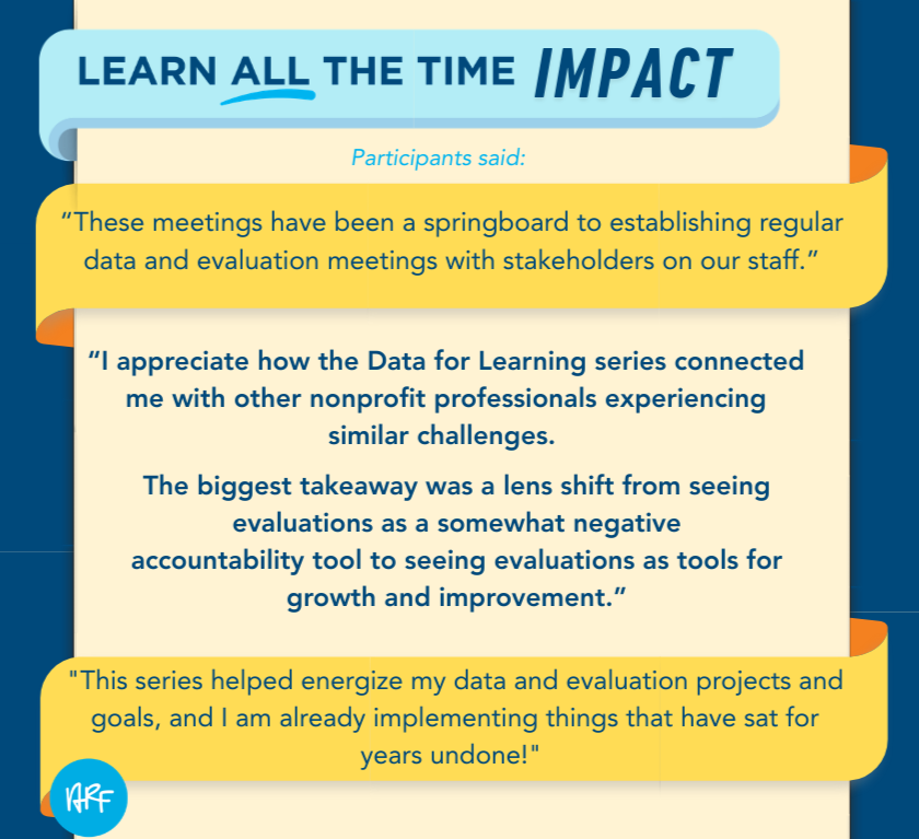 Beyond the practical tools, participants shared how valuable it was to connect with other nonprofit professionals navigating similar challenges—building a sense of support that extended beyond the cohort itself. And perhaps most encouraging: Participants began to shift how they view evaluation, letting go of the idea of it as a “negative accountability tool” and starting to see it more as a partner in learning and improvement.